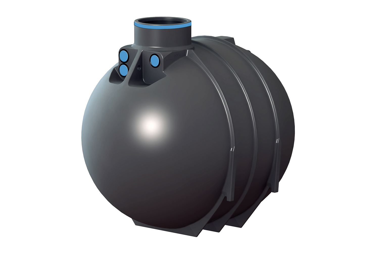 Podzemni ploščati rezervoar BLUELINE vključno z omejevalcem iztoka in zasilnim prelivom, vse predmontirano in pripravljeno za priklop.