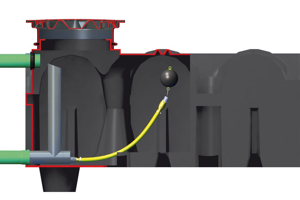 Podzemni ploščati rezervoar NEO vključno z omejevalcem iztoka in zasilnim prelivom, vse predmontirano in pripravljeno za priklop.